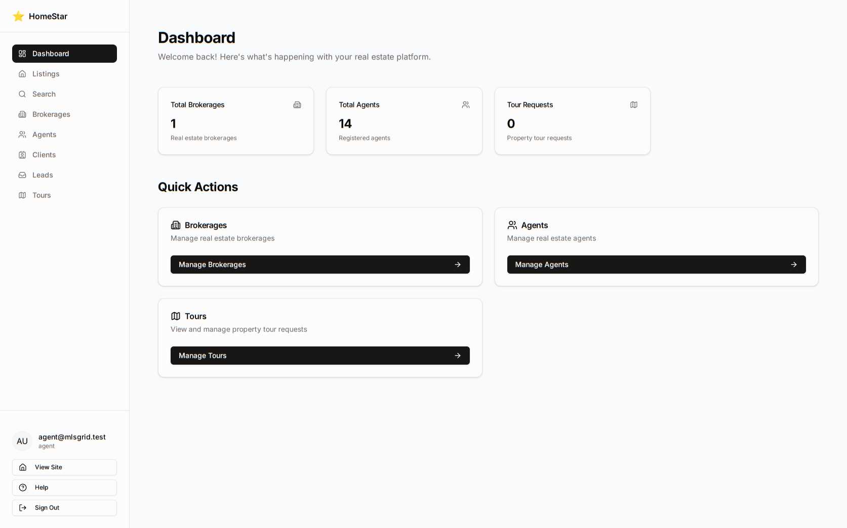 Dashboard: Shows personal listings, assigned leads, and scheduled tours.